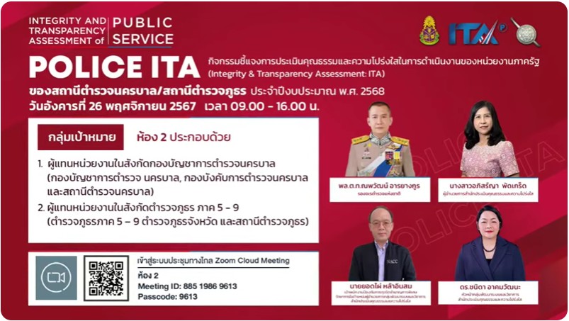 การประชุมระบบทางไกล Conference การขับเคลื่อนการประเมินคุณธรรมและความโปร่งใสในการดำเนินงานของหน่วยงานภาครัฐ (Integrity and Transparency Assessment: ITA) ของสถานีตำรวจประจำปีงบประมาณ พ.ศ. 2568 (ระดับสถานีตำรวจ) ครั้งที่ 1 โดยมีสาระสำคัญดังนี้ เมื่อวันที่ 26 พฤศจิกายน 2567 สถานีตำรวจภูธรรัตนวาปี ได้การเข้าร่วมกิจกรรมประชุมทางไกลและรับฟังคำชี้แจงการประเมินคุณธรรมและความโปร่งใสในการดำเนินงานของหน่วยงานภาครัฐ (ITA) ของสถานีตำรวจนครบาลและสถานีตำรวจภูธร ประจำปีงบประมาณ พ.ศ. 2568 ในรูปแบบ online โดยมี พล.ต.ท.ณวัตน์ อารยางกูร รองจเรตำรวจแห่งชาติ เป็นประธานในพิธีเปิด ผ่านระบบ ZOOM โดยมอบหมายให้ทุกหน่วยงานเข้าระบบ Zoom เนื่องจากมีการลงทะเบียนเข้าร่วมกิจกรรมฯ เป็นจำนวนมาก และ ทาง สำนักงาน ป.ป.ช. ได้มีการถ่ายทอดสดผ่าน YouTube Channel Clinic ITA ซึ่งการประชุมดังกล่าวมีวัตถุประสงค์ เพื่ออบรม อธิบายการปฏิบัติในปีงบประมาณ 2568 ของการขับเคลื่อนการประเมินคุณธรรมและความโปร่งใสในการดำเนินงานของหน่วยงานภาครัฐ (Integrity and Transparency Assessment: ITA) ของสถานีตำรวจ และทำความเข้าใจกรอบการประเมินคุณธรรมและความโปร่งใสในการดำเนินงานของหน่วยงาน ภาครัฐ (Integrity and Transparency Assessment: ITA) ของสถานีตำรวจ ประจำปีงบประมาณ พ.ศ. 2568 ประกอบด้วย 3 ประเด็นสำคัญ ได้แก่